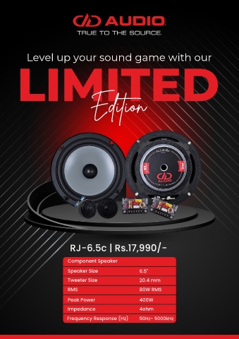 Level up your sound game with our LIMITED Edition RJ-6.5c | Rs.17,990/- Component Speaker Speaker Size 6.5" Tweeter Size 20.4 mm RMS 80W RMS Peak Power 400W Impedance 4ohm Frequency Response (Hz) 50Hz- 5000kHz