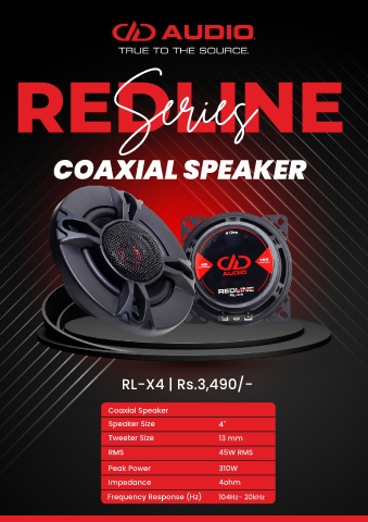 REDLINE Series COAXIAL SPEAKER RL-X4 | Rs.3,490/- Coaxial Speaker Speaker Size 4" Tweeter Size 13 mm RMS 45W RMS Peak Power 310W Impedance 4ohm Frequency Response (Hz) 104Hz- 20kHz
