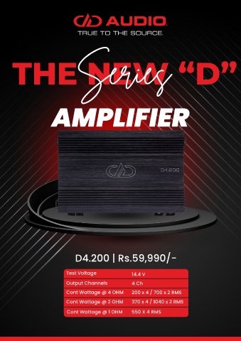 Series THE NEW “D” AMPLIFIER D4.200 | Rs.59,990/- Test Voltage 14.4 V Output Channels 4 Ch Cont Wattage @ 4 OHM 200 x 4 / 700 x 2 RMS Cont Wattage @ 2 OHM 370 x 4 / 1040 x 2 RMS Cont Wattage @ 1 OHM 550 X 4 RMS